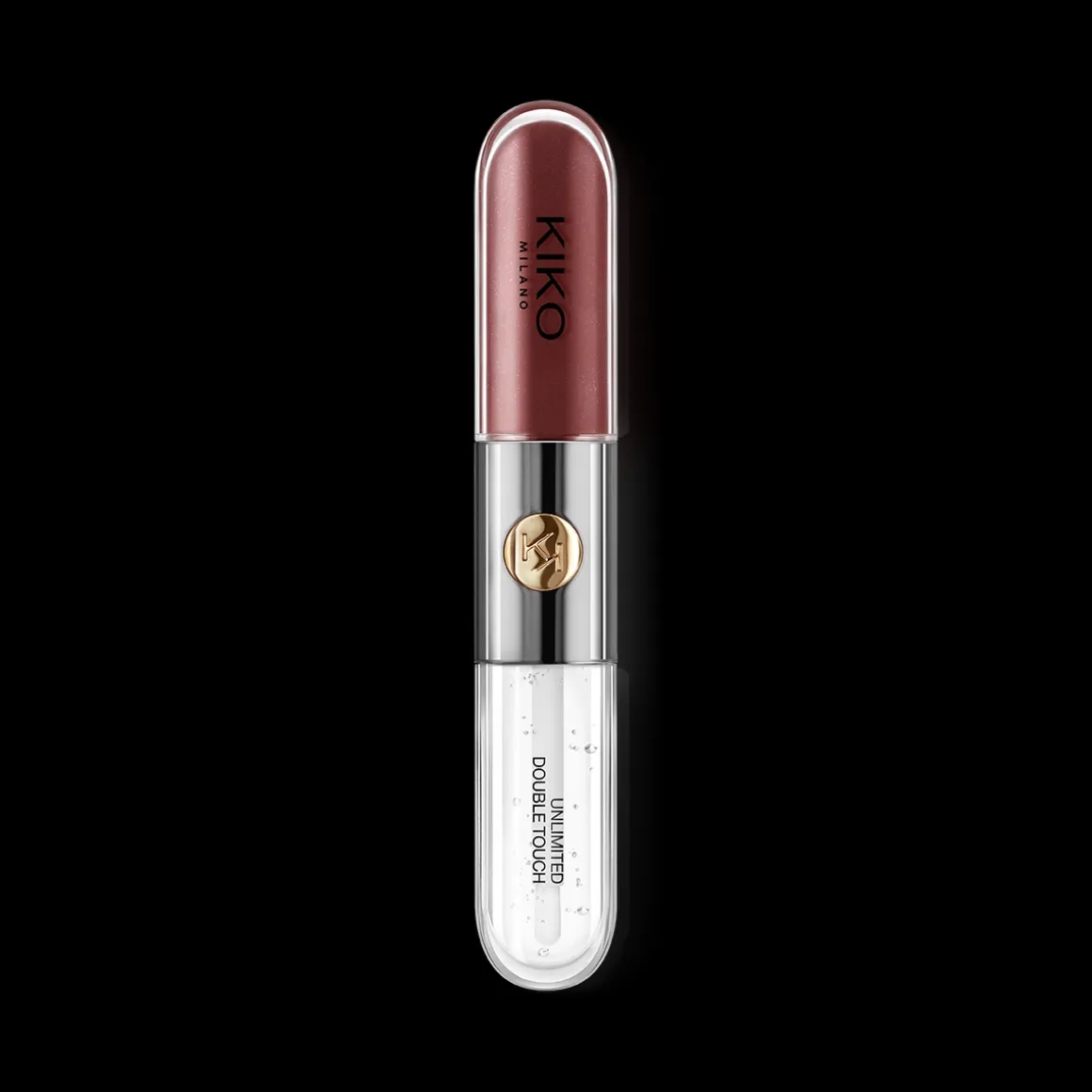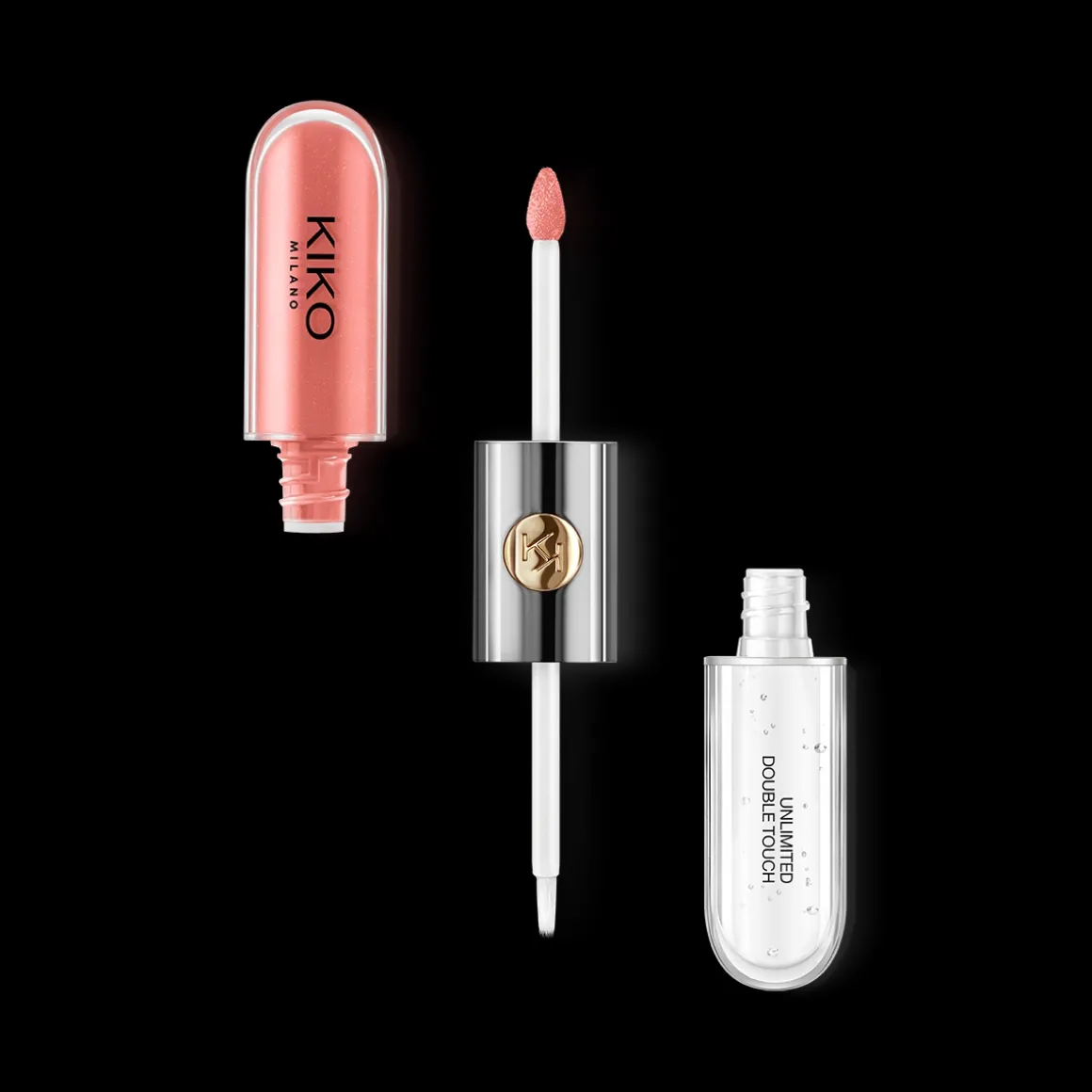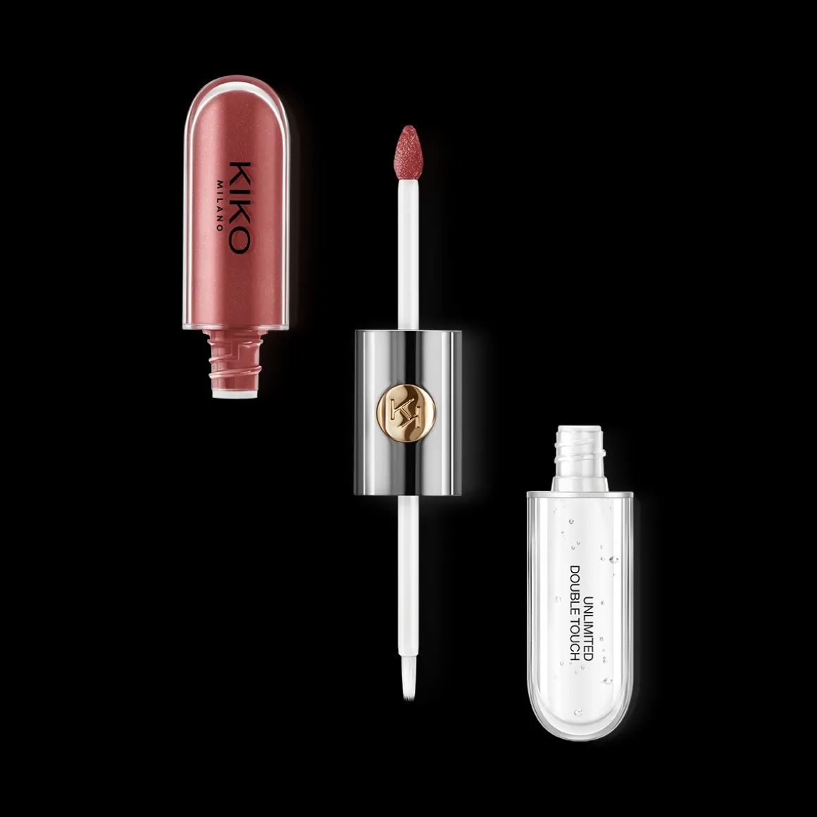 Le rouge à lèvres propose deux applicateurs adaptés à chaque texture : l’applicateur floqué de la base colorée garantit une précision optimale, tandis que celui du gloss est muni de poils, pour un dosage parfait. Son design fonctionnel et élégant se distingue grâce à sa partie centrale en métal ornée du monogramme KK.